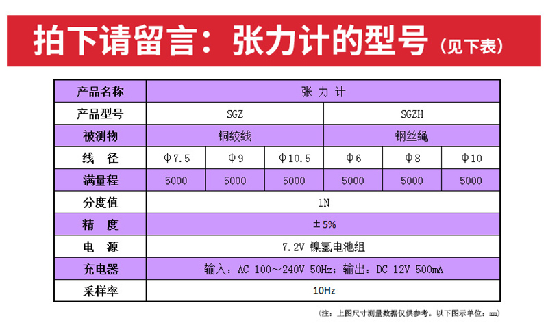 DGZ-C绳索张力计可测量铜绞线张力和钢丝绳张力,其规格如下表: